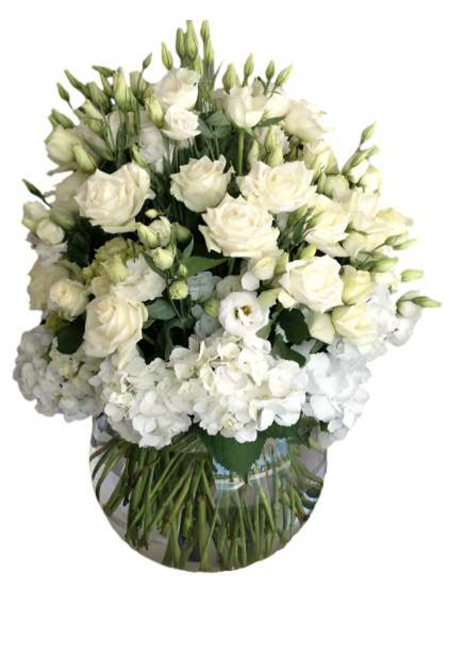 This sophisticated arrangement features a dense blend of premium white blooms, carefully hand-arranged in a clear glass fishbowl (bubble) vase. The design emphasizes texture and volume, transitioning from the soft, ruffled petals of hydrangeas at the base to the structured elegance of roses and delicate lisianthus at the top.